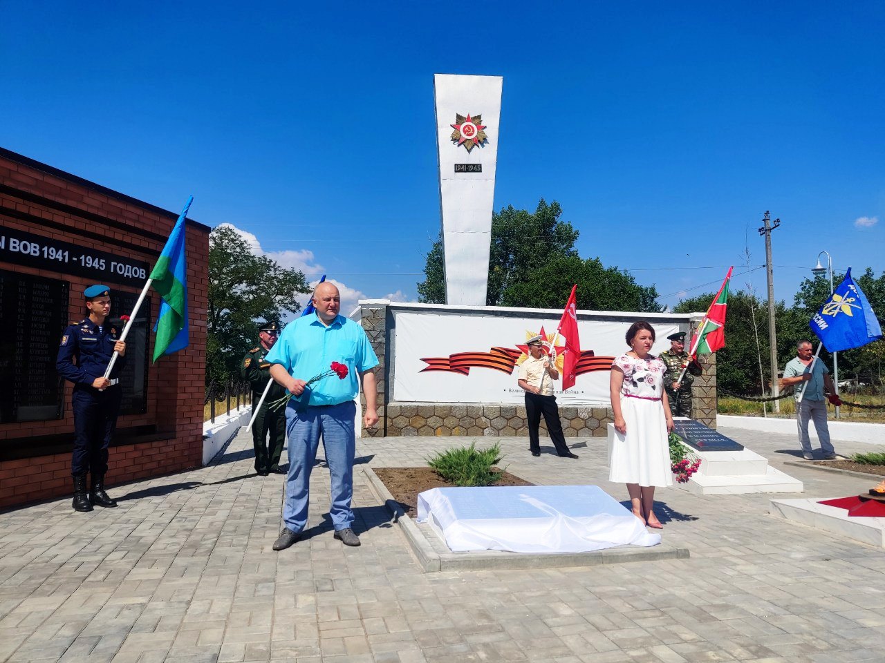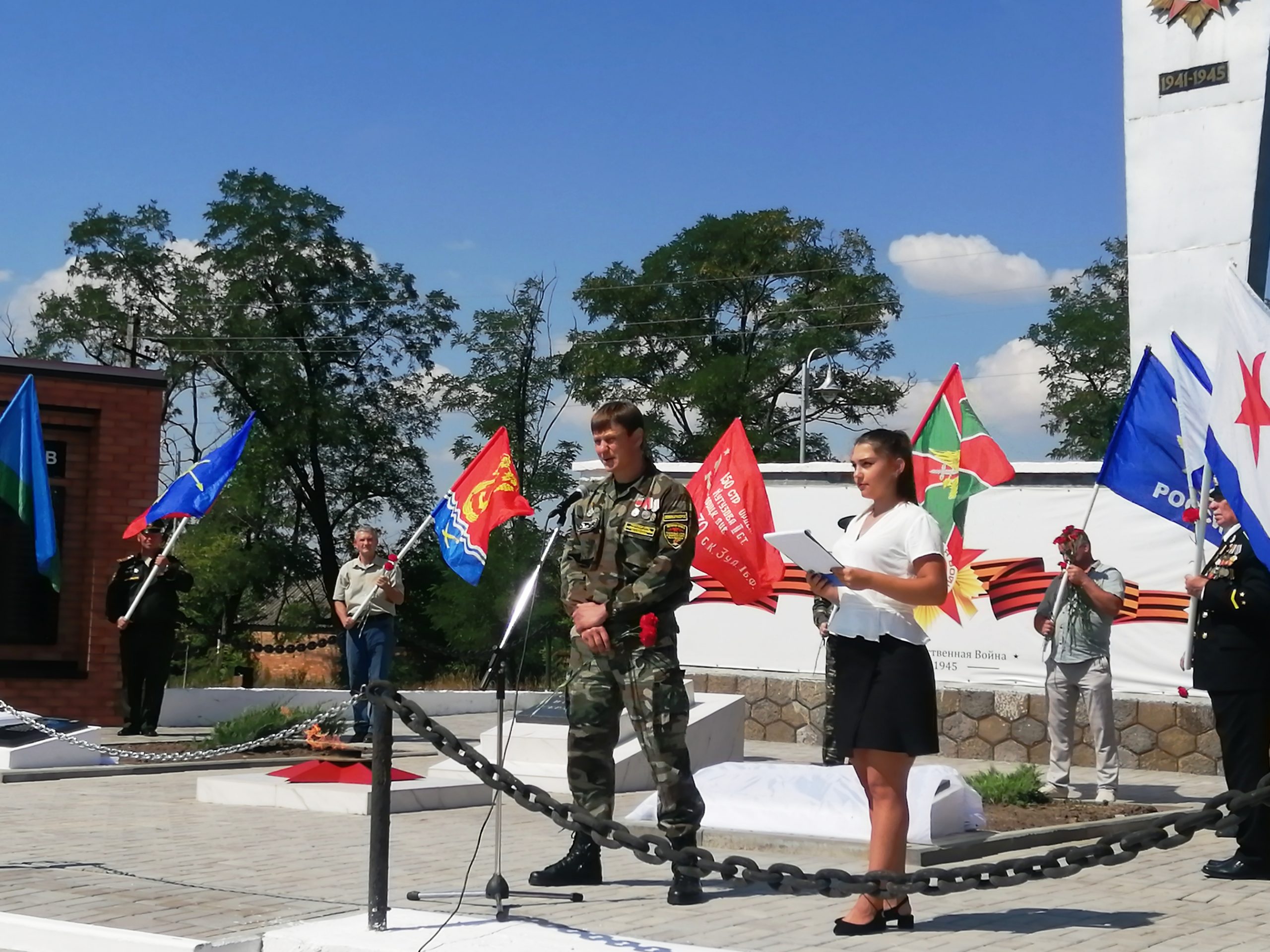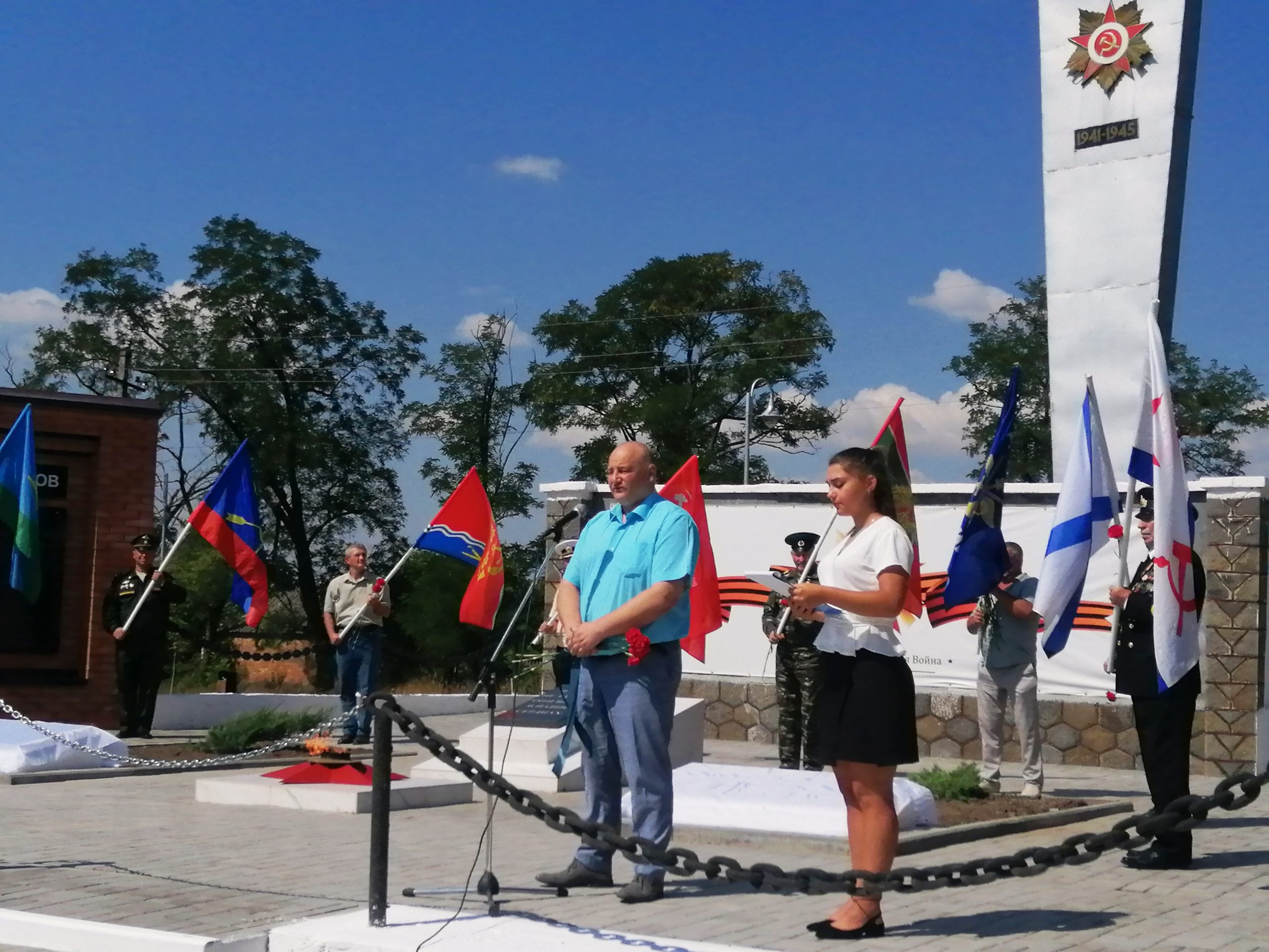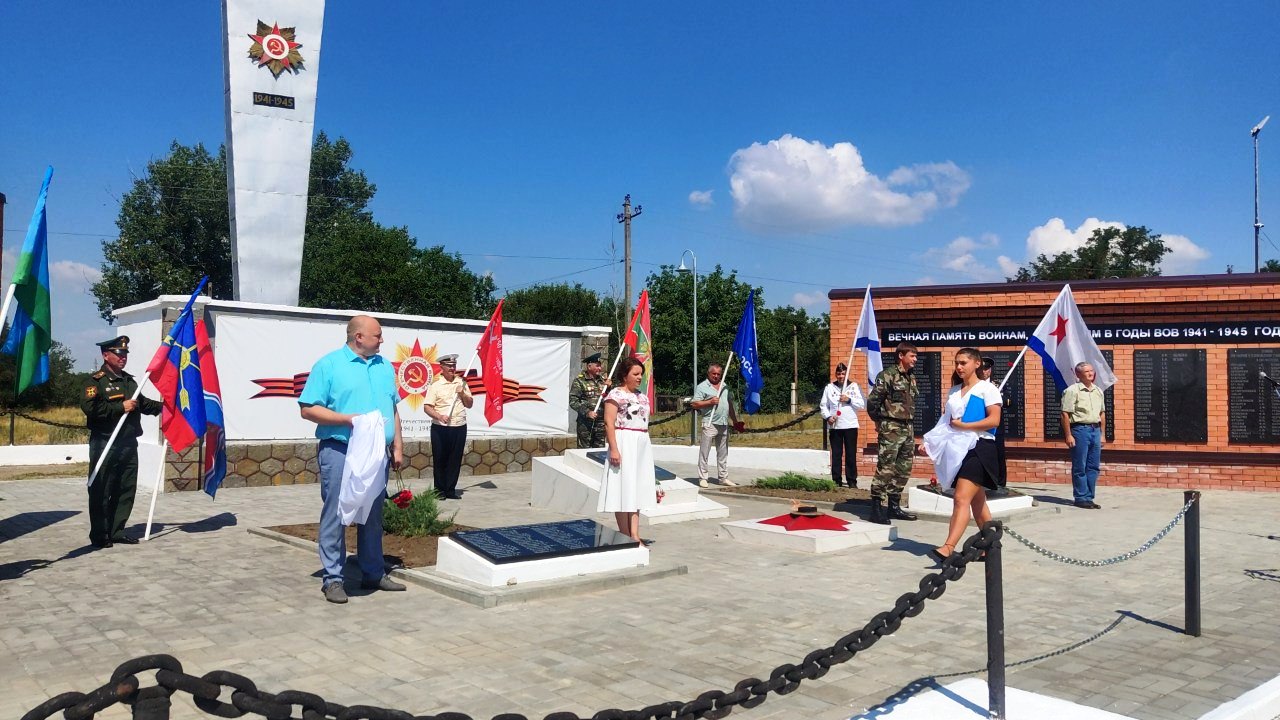 Под звуки гимна Российской Федерации, в торжественной обстановке, мемориальные памятные плиты открыли: Евгений Сухоручкин, Инесса Васькова, Максим Дуля и Алексей Рыбин — специалист Усть-Донецкого учебного центра регионального отделения ДОСААФ России Ростовской области.