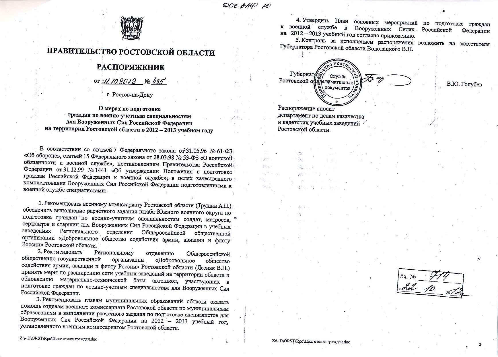 О мерах по подготовке граждан по военно-учетным специальностям для Вооруженных Сил Российской Федерации на территории Ростовской области в 2012-2013 году