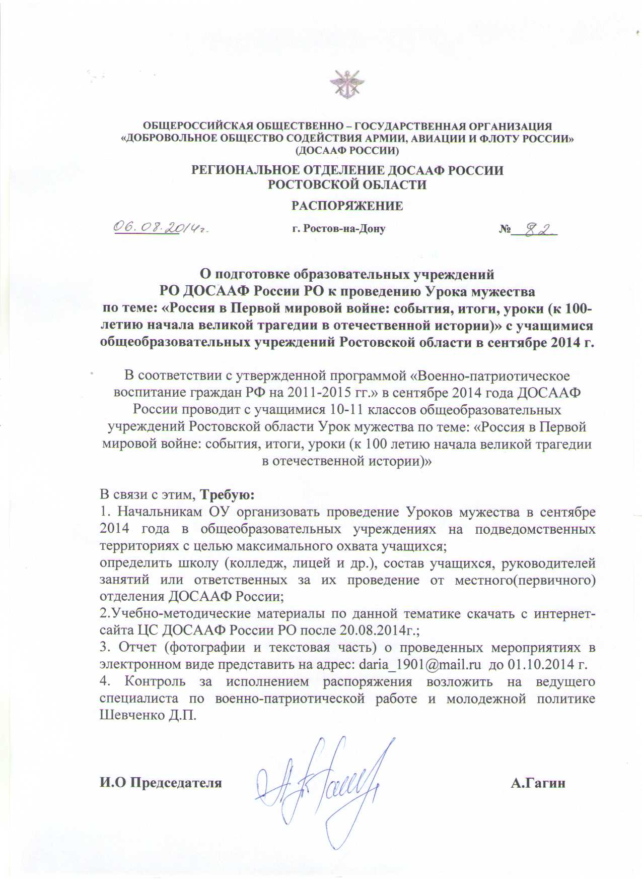 «Распоряжение №4 от 14.01.2013 » о проведении в 2014 году Всероссийского месячника оборонно-массовой работы».