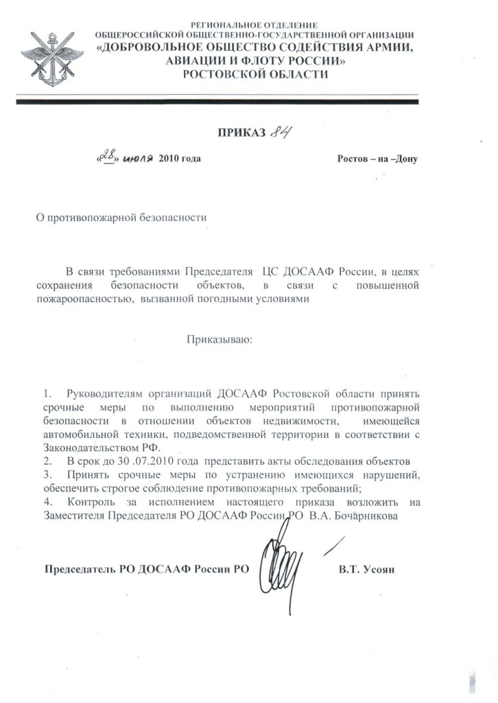 Приказ о противопожарной безопасности № 84 от 28.07.2010г