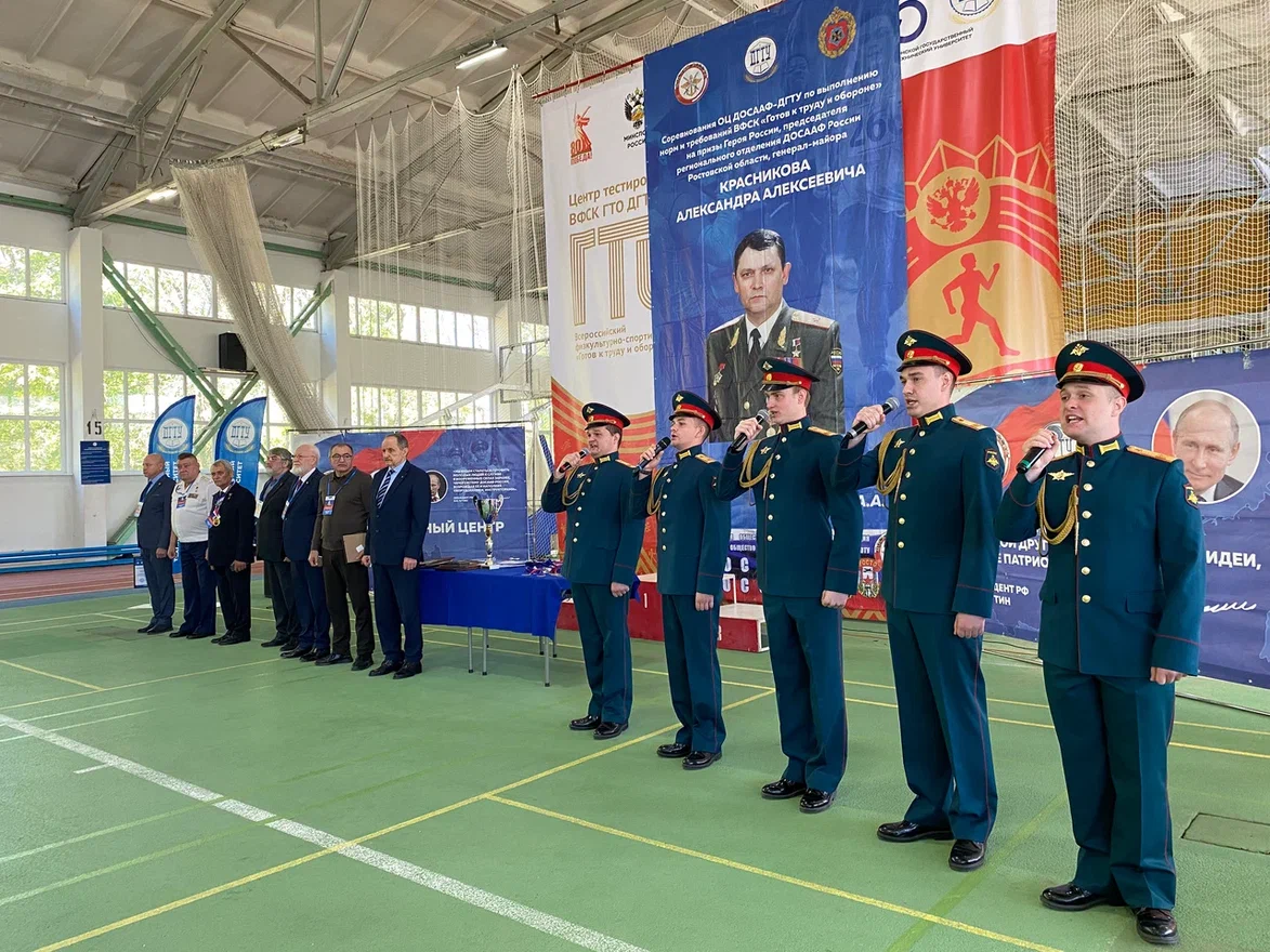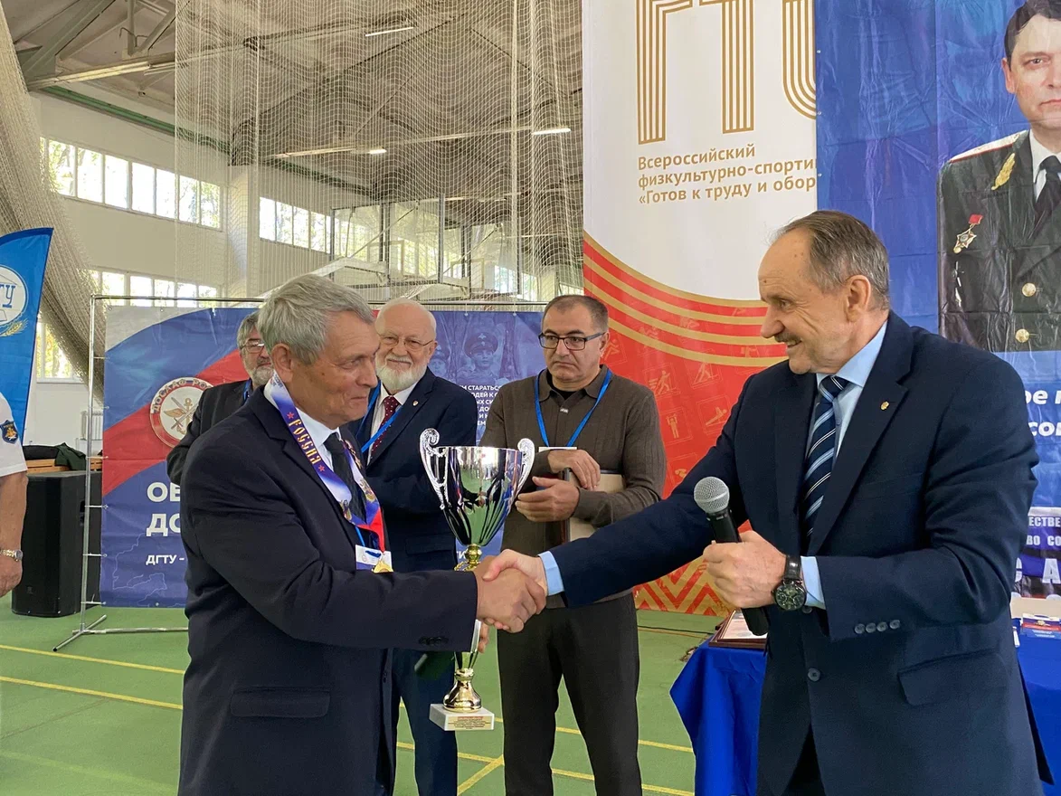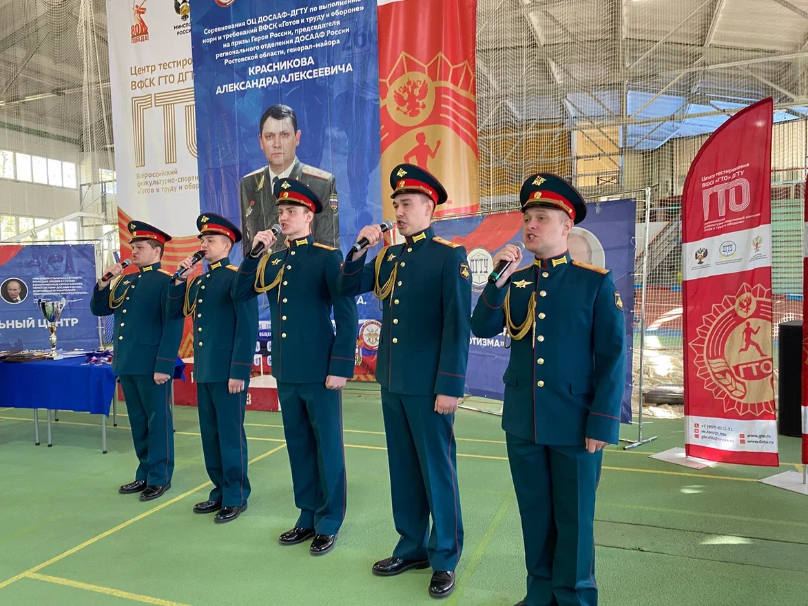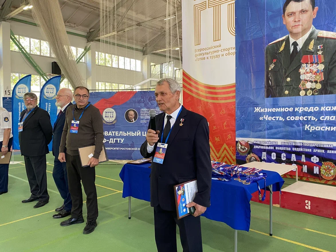 От имени ректора ДГТУ Бесариона Месхи участников со спортивным праздником поздравил основатель военно-патриотических турниров Героев СССР и России, руководитель образовательного центра ДОСААФ-ДГТУ полковник Николай Могилинец. Он вручил памятный кубок и медаль Герою России А.А. Красникову и напомнил собравшимся лозунг: «От значка ГТО – к олимпийской медали».