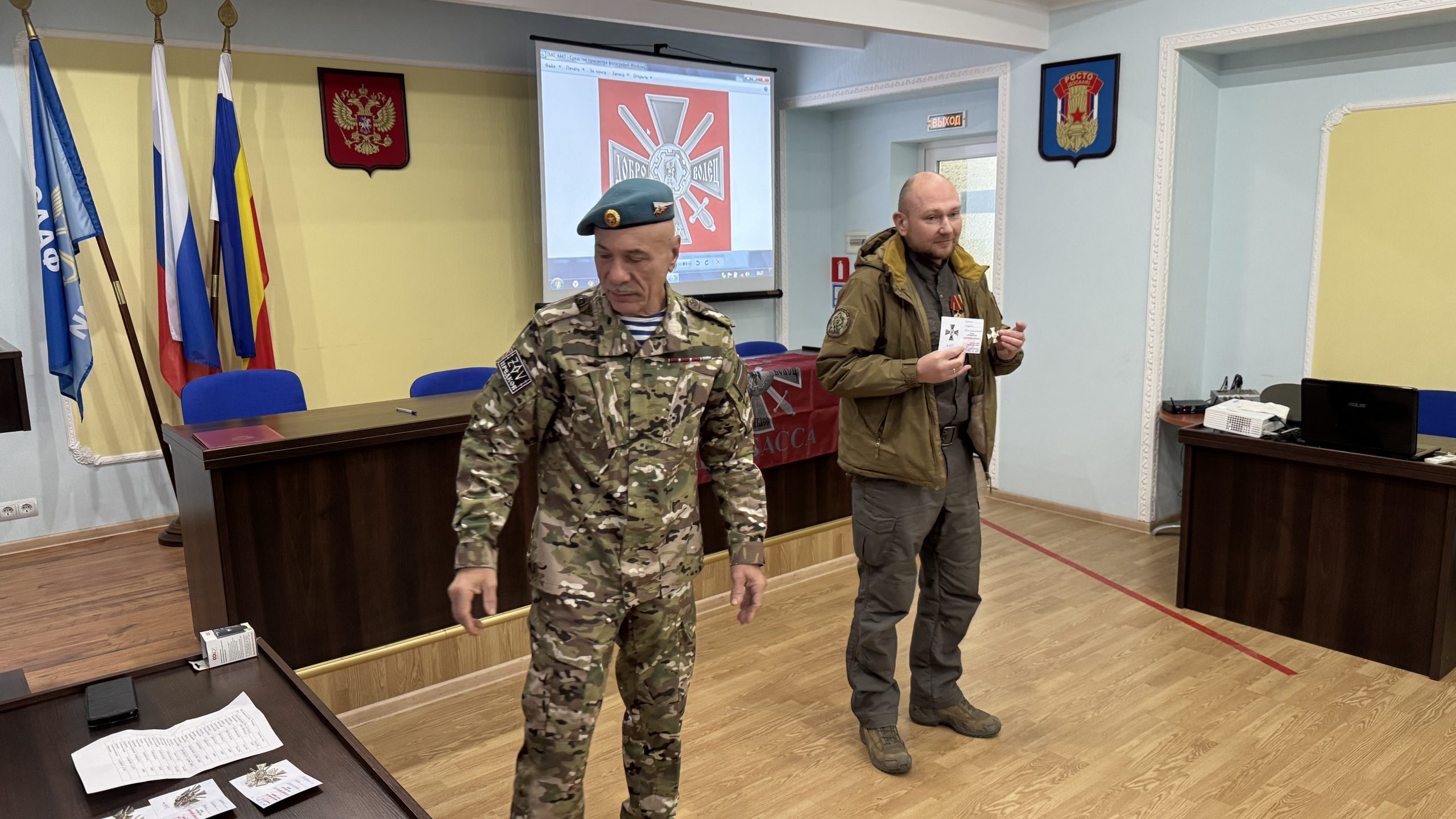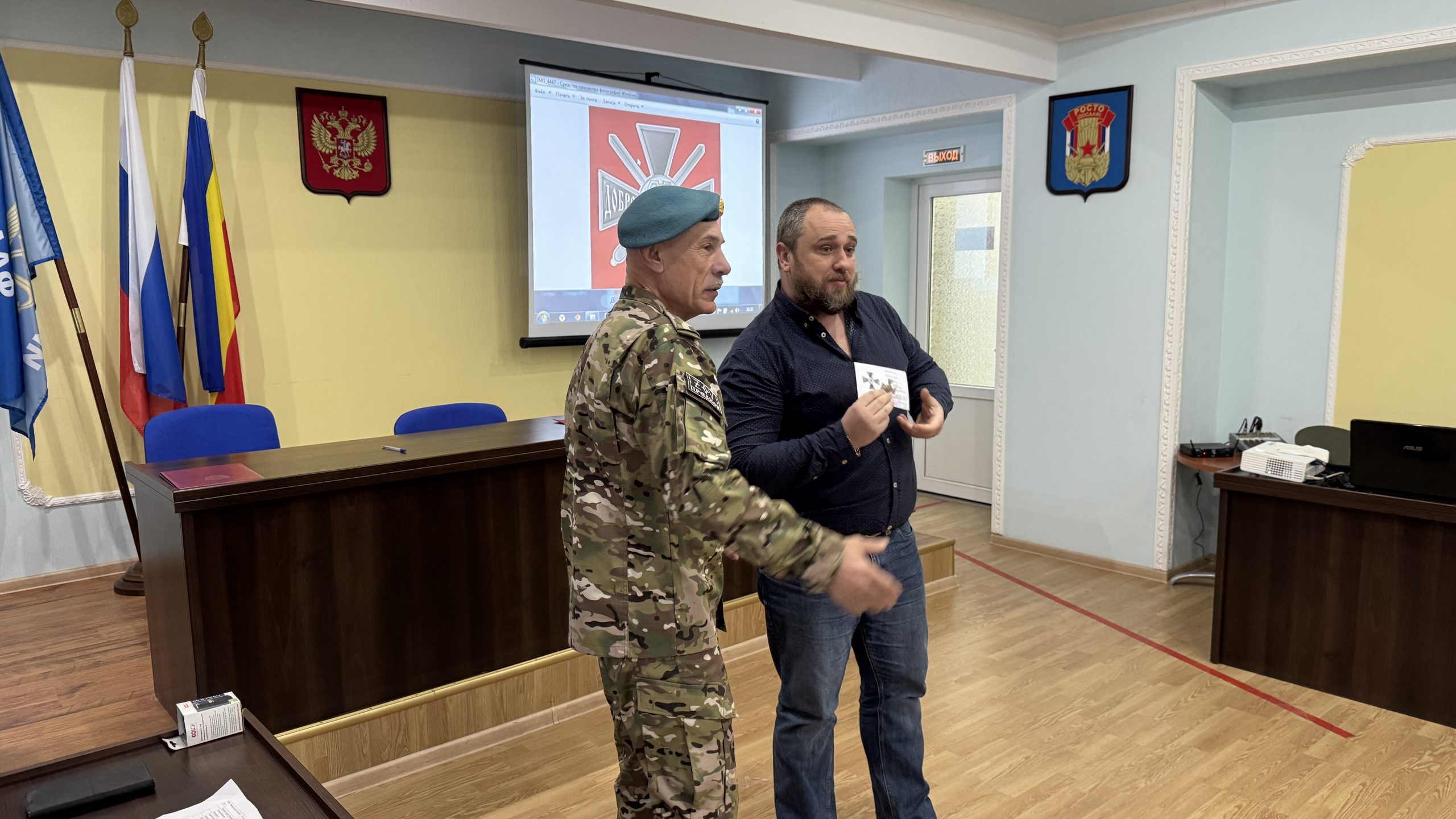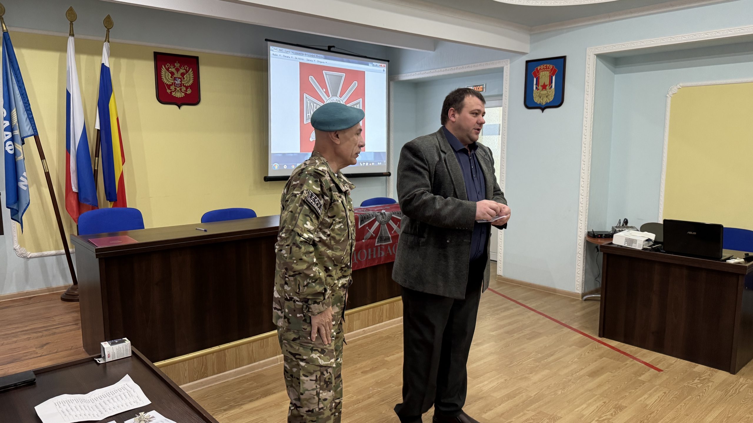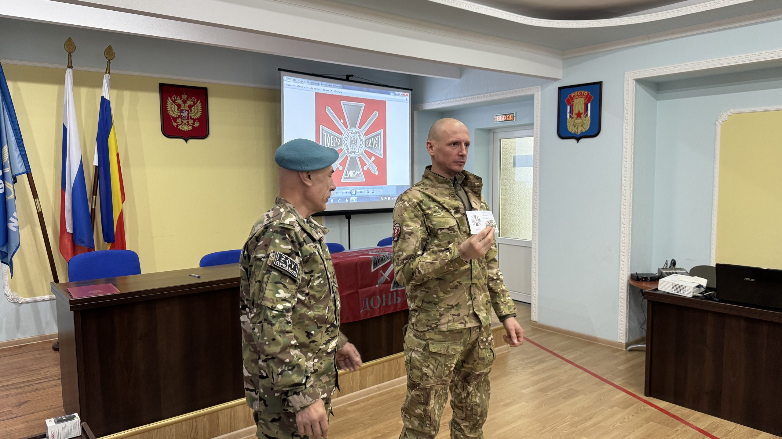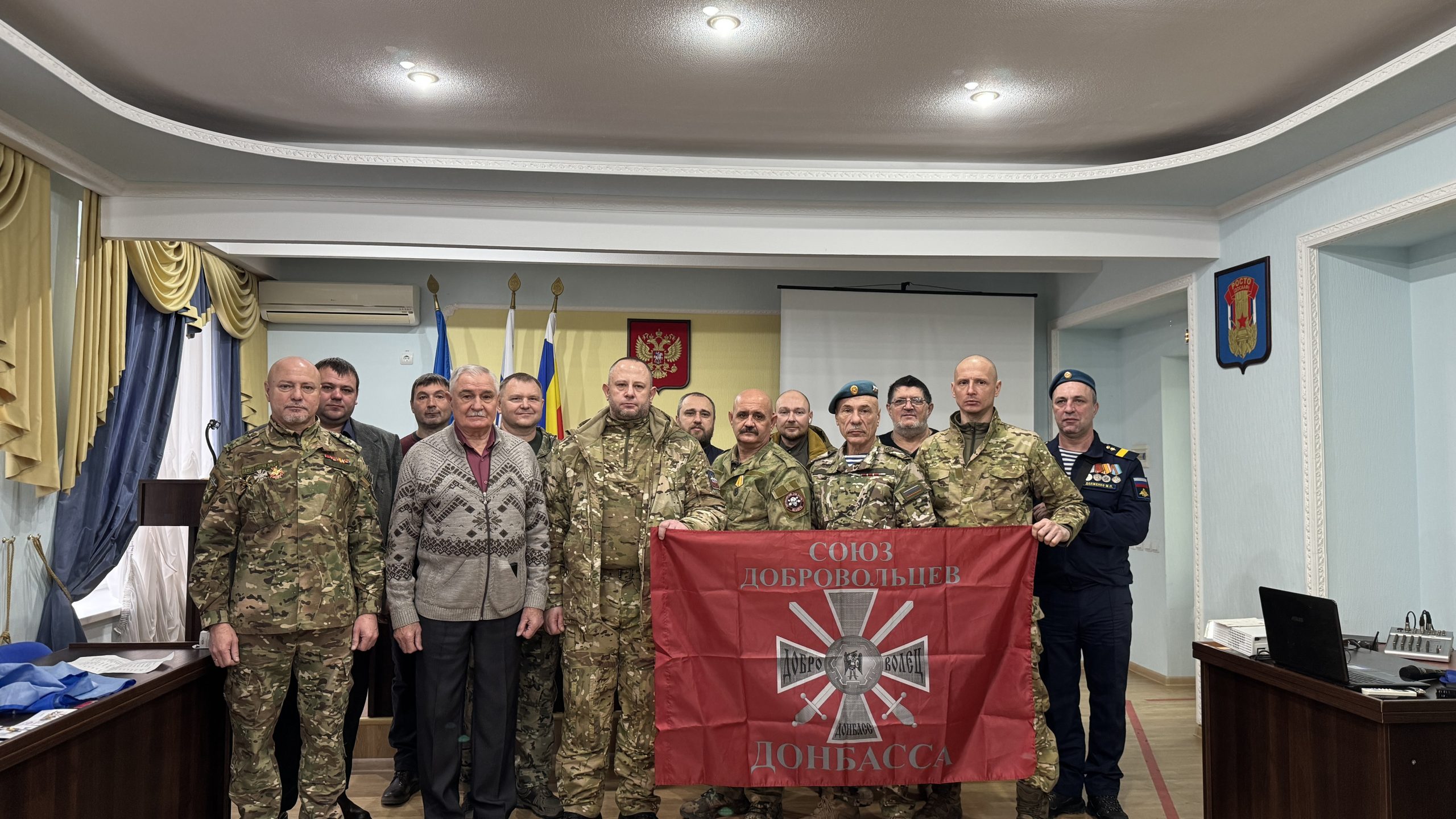 В пятницу, 26 декабря, состоялась встреча руководства и коллективов Регионального отделения ДОСААФ России Ростовской области и Регионального отделения МОО «Союз добровольцев Донбасса». С вступительным словом выступил Председатель РО ДОСААФ России Ростовской области полковник Верёвка Виктор Викторович, руководителем Ростовского отделения Союза добровольцев Донбасса, кавалером трёх орденов Мужества полковником Субботиным Александром Владимировичем были вручены знаки отличия и удостоверения новым членам Союза. На мероприятие были приглашены юнармейцы школ Советского района Ростова-на-Дону, которые пообщались с ветеранами СВО, получили информацию о ходе ведения боевых действий, поздравили их с вступлением в ряды Союза добровольцев Донбасса.