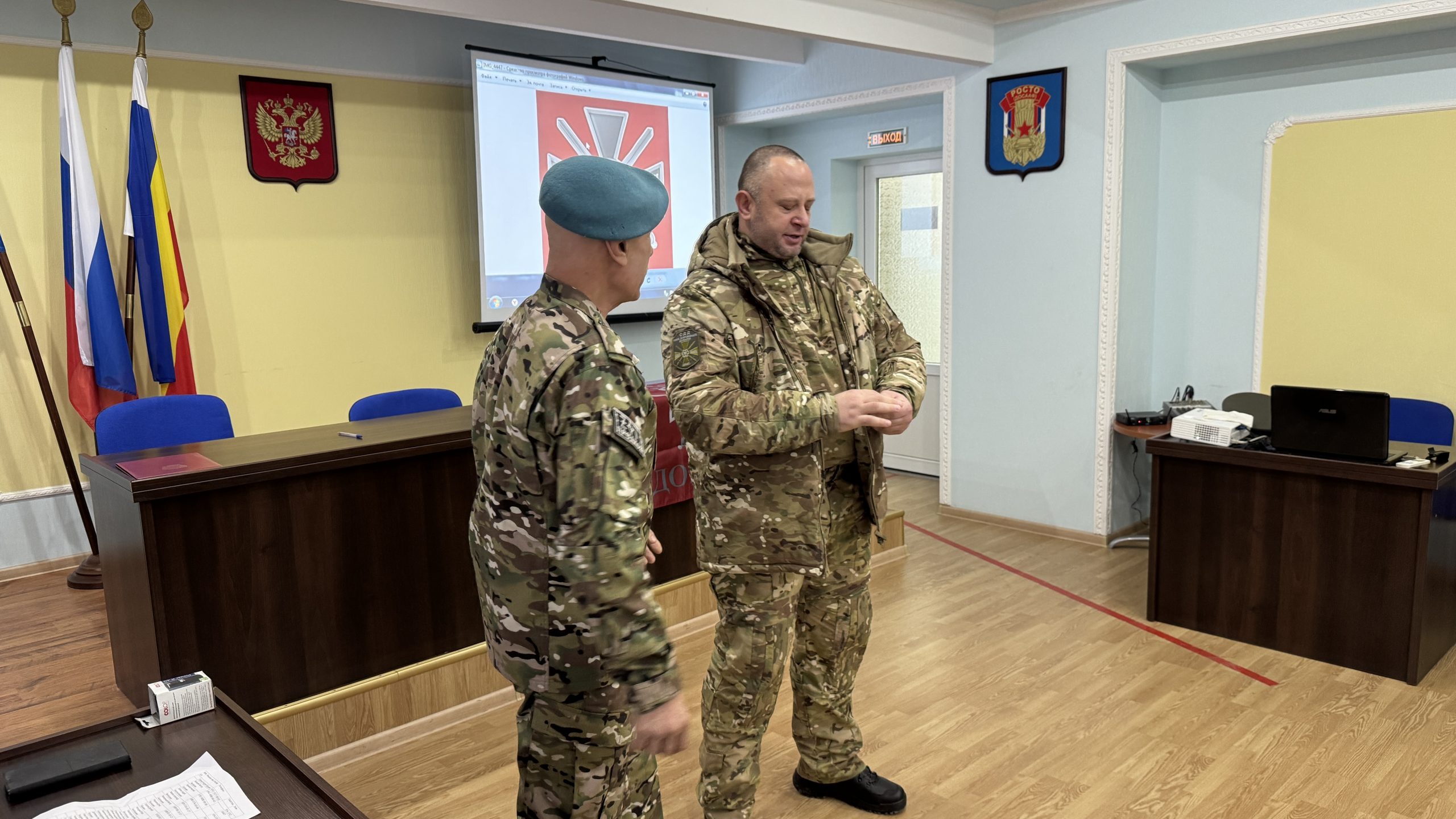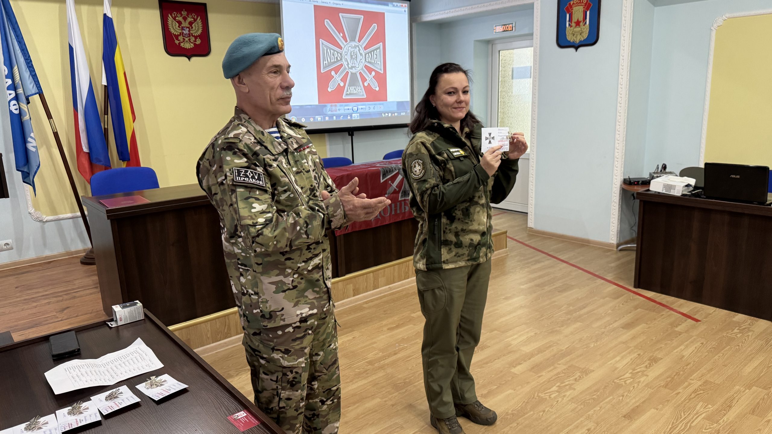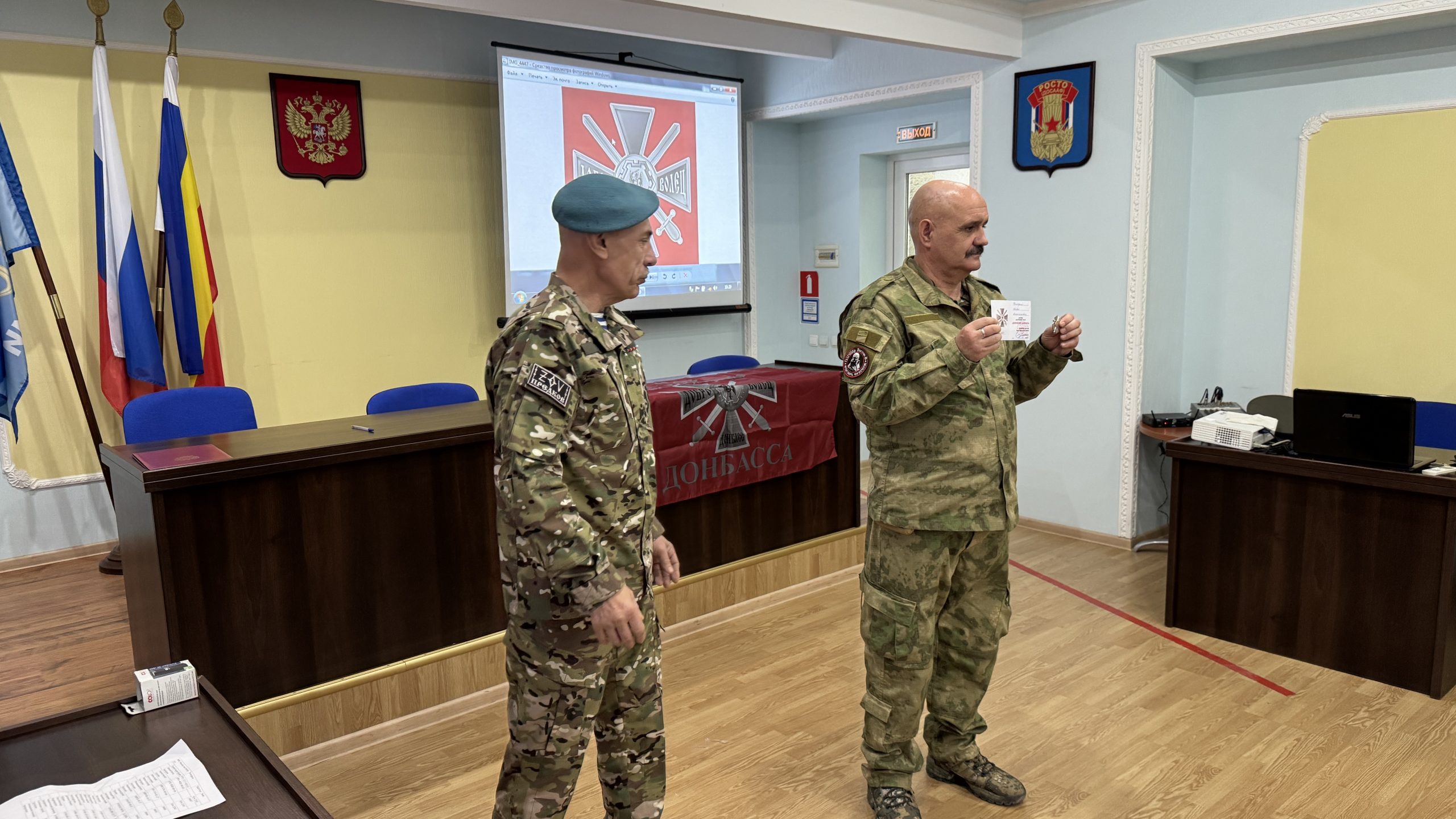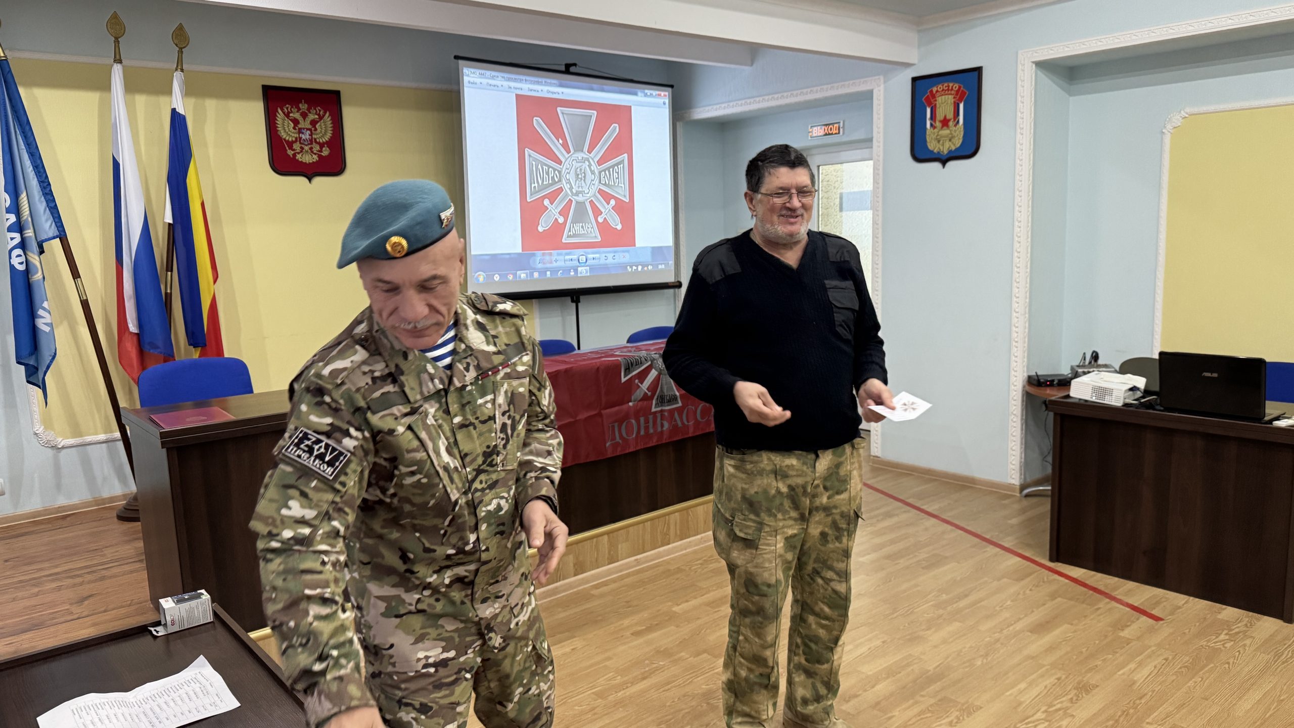 В пятницу, 26 декабря, состоялась встреча руководства и коллективов Регионального отделения ДОСААФ России Ростовской области и Регионального отделения МОО «Союз добровольцев Донбасса». С вступительным словом выступил Председатель РО ДОСААФ России Ростовской области полковник Верёвка Виктор Викторович, руководителем Ростовского отделения Союза добровольцев Донбасса, кавалером трёх орденов Мужества полковником Субботиным Александром Владимировичем были вручены знаки отличия и удостоверения новым членам Союза. На мероприятие были приглашены юнармейцы школ Советского района Ростова-на-Дону, которые пообщались с ветеранами СВО, получили информацию о ходе ведения боевых действий, поздравили их с вступлением в ряды Союза добровольцев Донбасса.