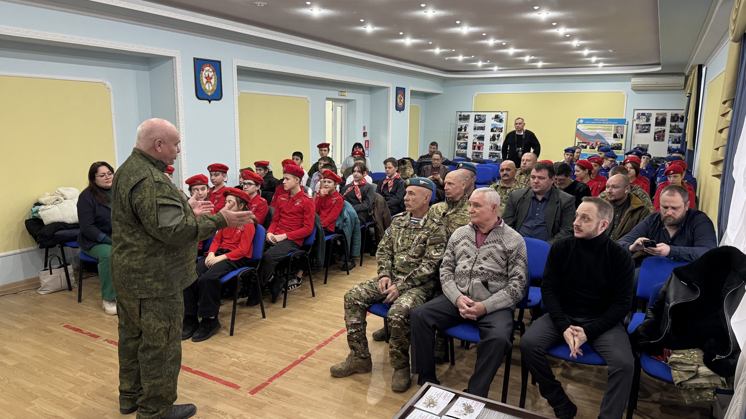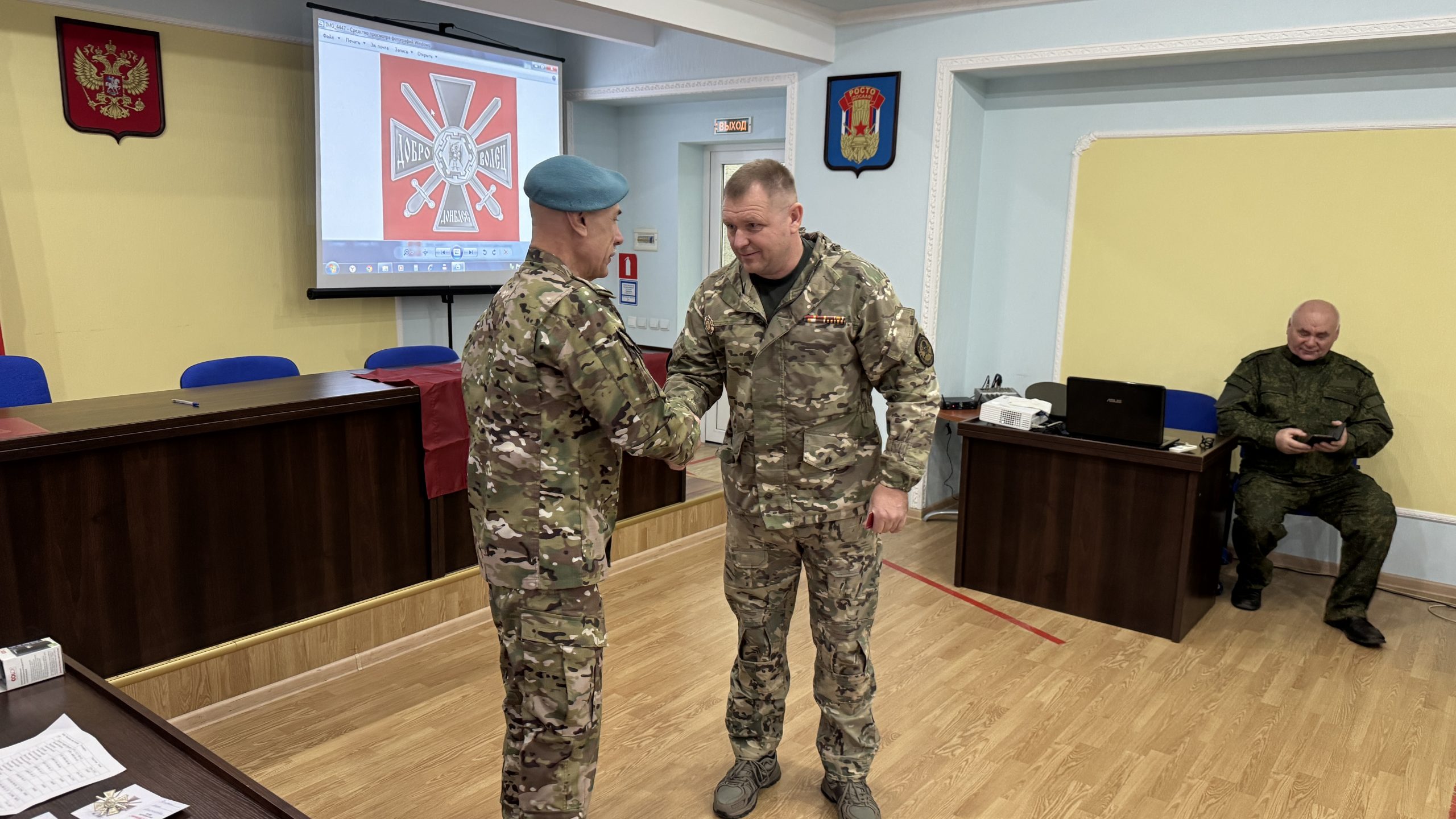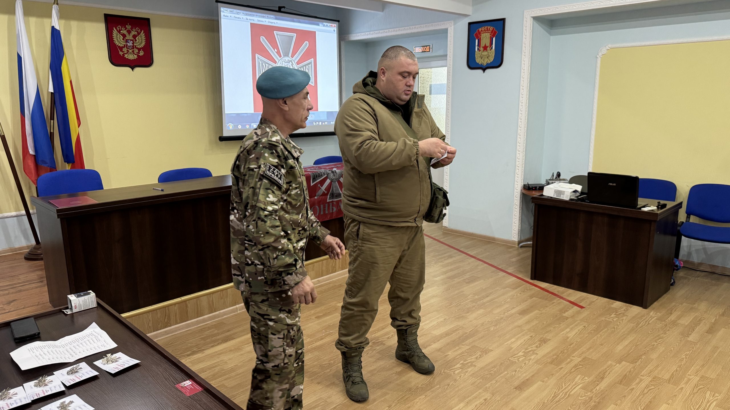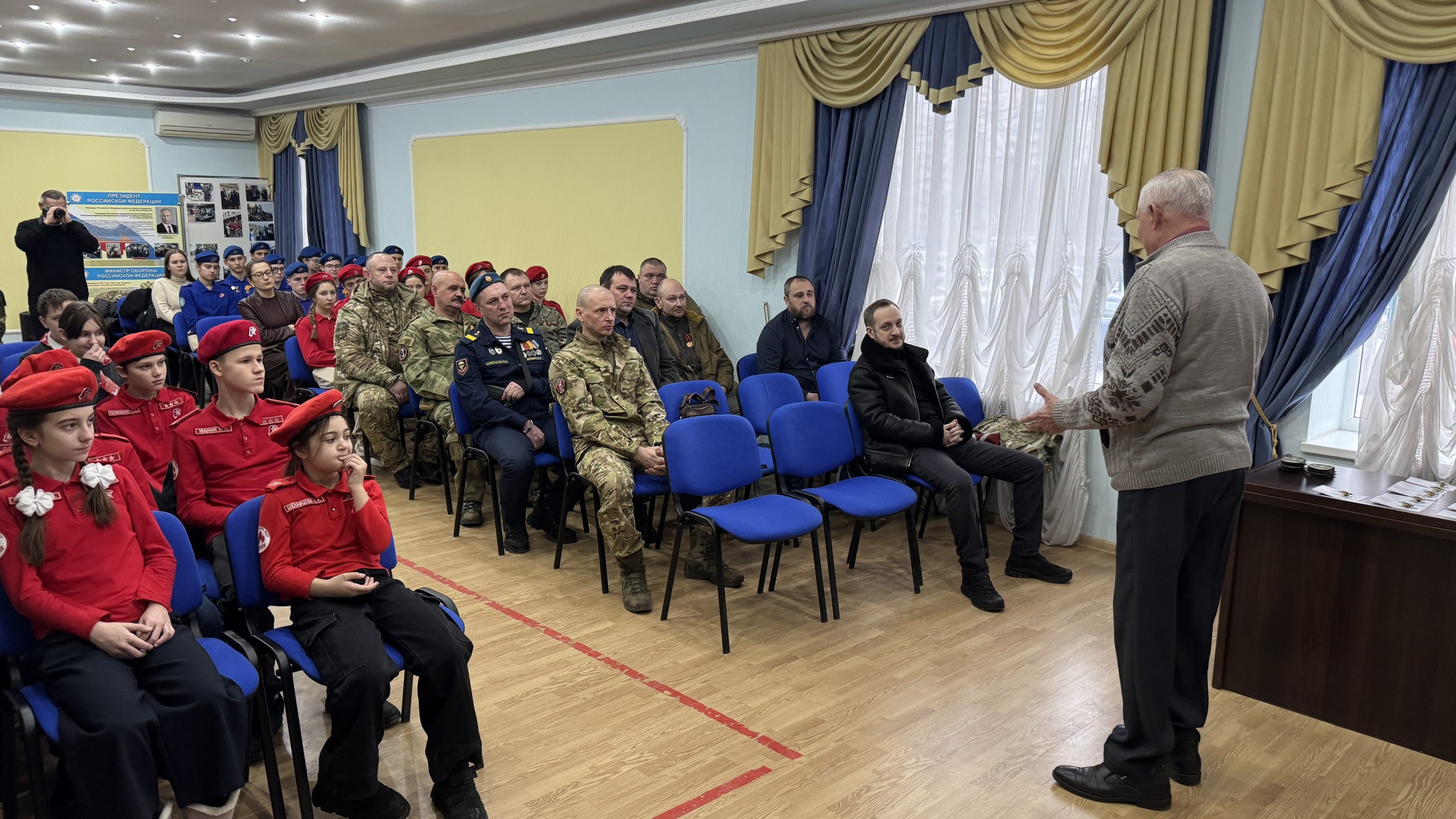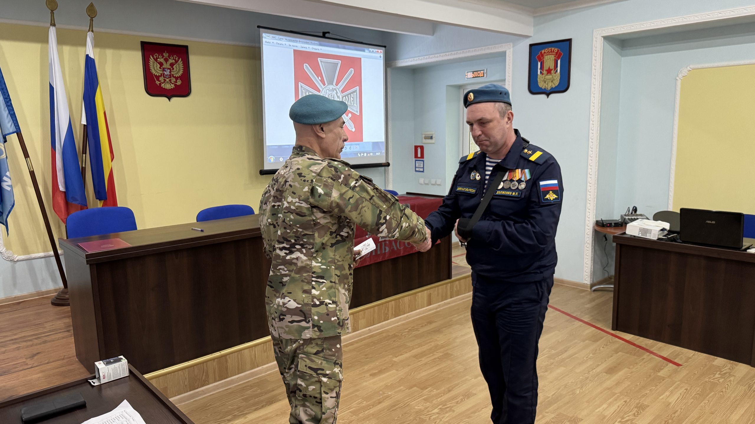 В пятницу, 26 декабря, состоялась встреча руководства и коллективов Регионального отделения ДОСААФ России Ростовской области и Регионального отделения МОО «Союз добровольцев Донбасса». С вступительным словом выступил Председатель РО ДОСААФ России Ростовской области полковник Верёвка Виктор Викторович, руководителем Ростовского отделения Союза добровольцев Донбасса, кавалером трёх орденов Мужества полковником Субботиным Александром Владимировичем были вручены знаки отличия и удостоверения новым членам Союза. На мероприятие были приглашены юнармейцы школ Советского района Ростова-на-Дону, которые пообщались с ветеранами СВО, получили информацию о ходе ведения боевых действий, поздравили их с вступлением в ряды Союза добровольцев Донбасса.