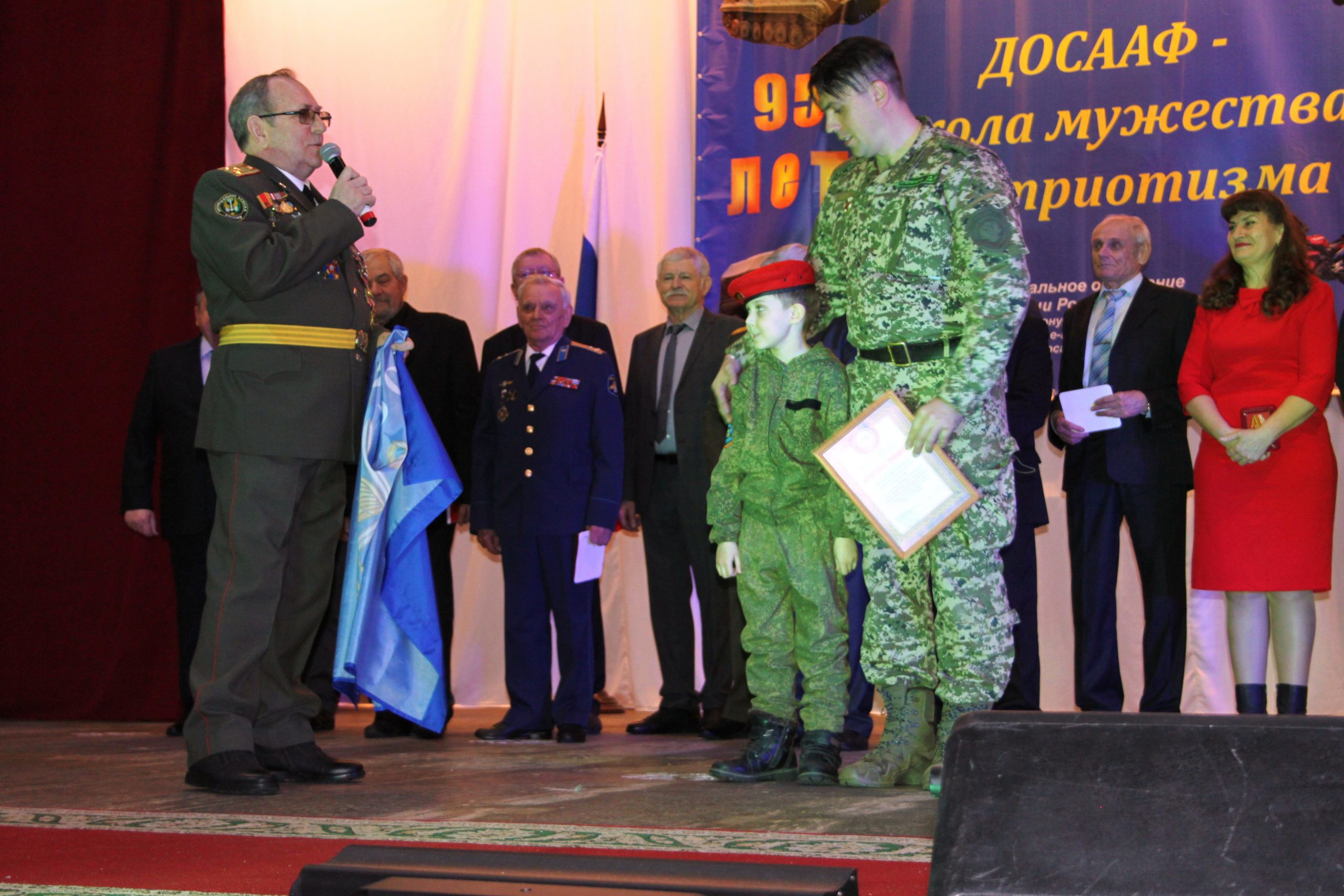 Особо волнительным моментом торжественного мероприятия была эстафета передачи Флага ДОСААФ России ветеранами ДОСААФ, которые все вышли на сцену, самому юному члену военно-патриотического Юнармейского клуба «Георгиевцы» при РО ДОСААФ России РО, которое символизировало непрерывную связь поколений, продолжение традиций и дальнейшее развитие организации.