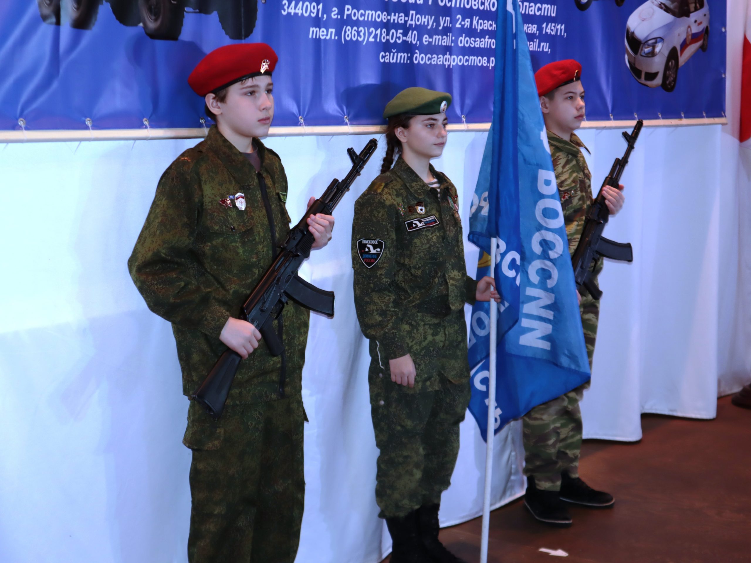 И вот наступил торжественный момент. В 14-00 зазвучали позывные, фанфары, извещающие о начале праздничного мероприятия. В почетном карауле, на сцене, под знаменами Российской Федерации, ДОСААФ России и Южного военного округа замерли Юнармейцы, будущие продолжатели славных дел организации.