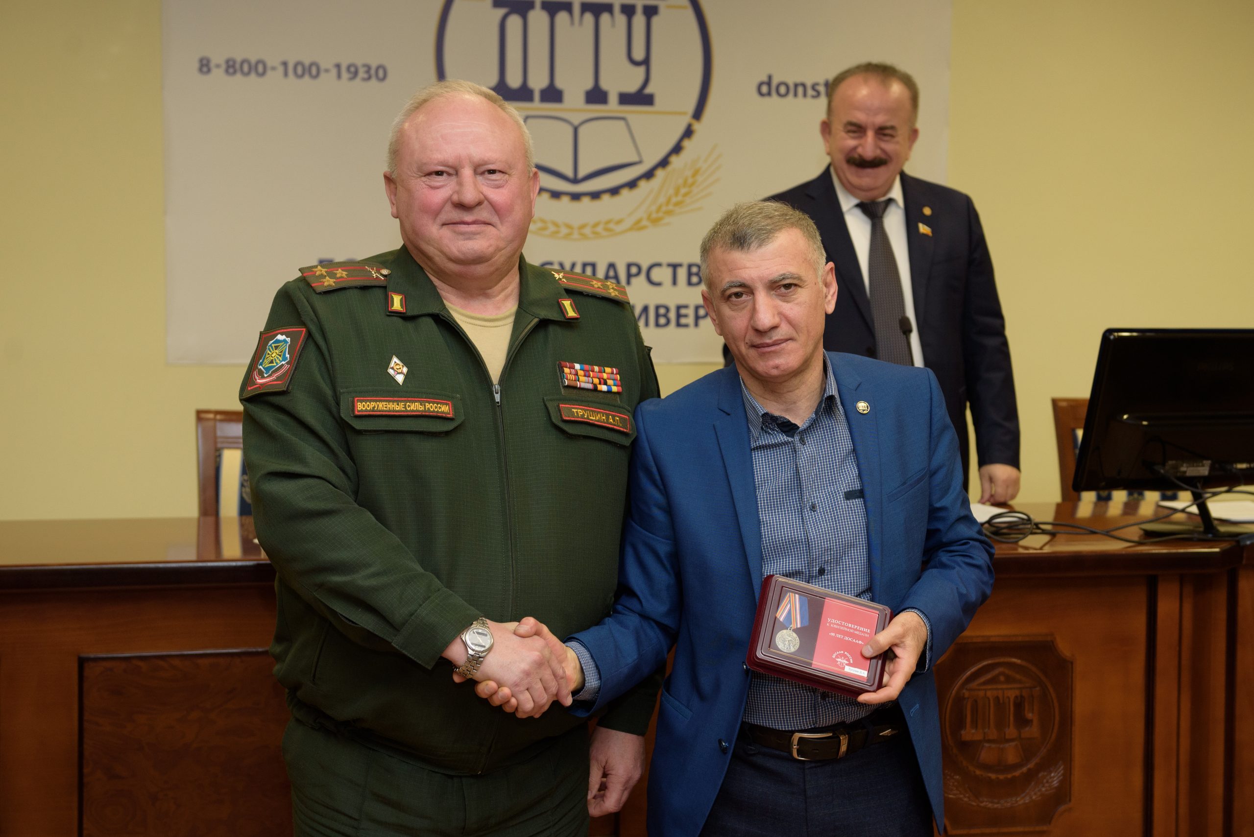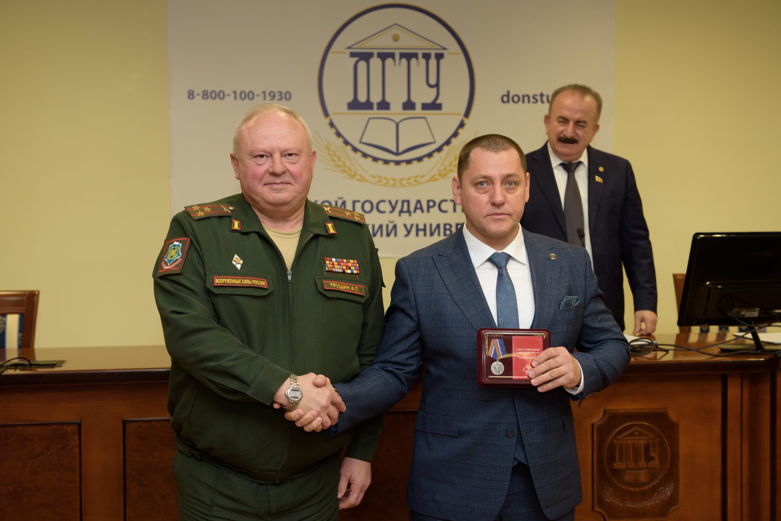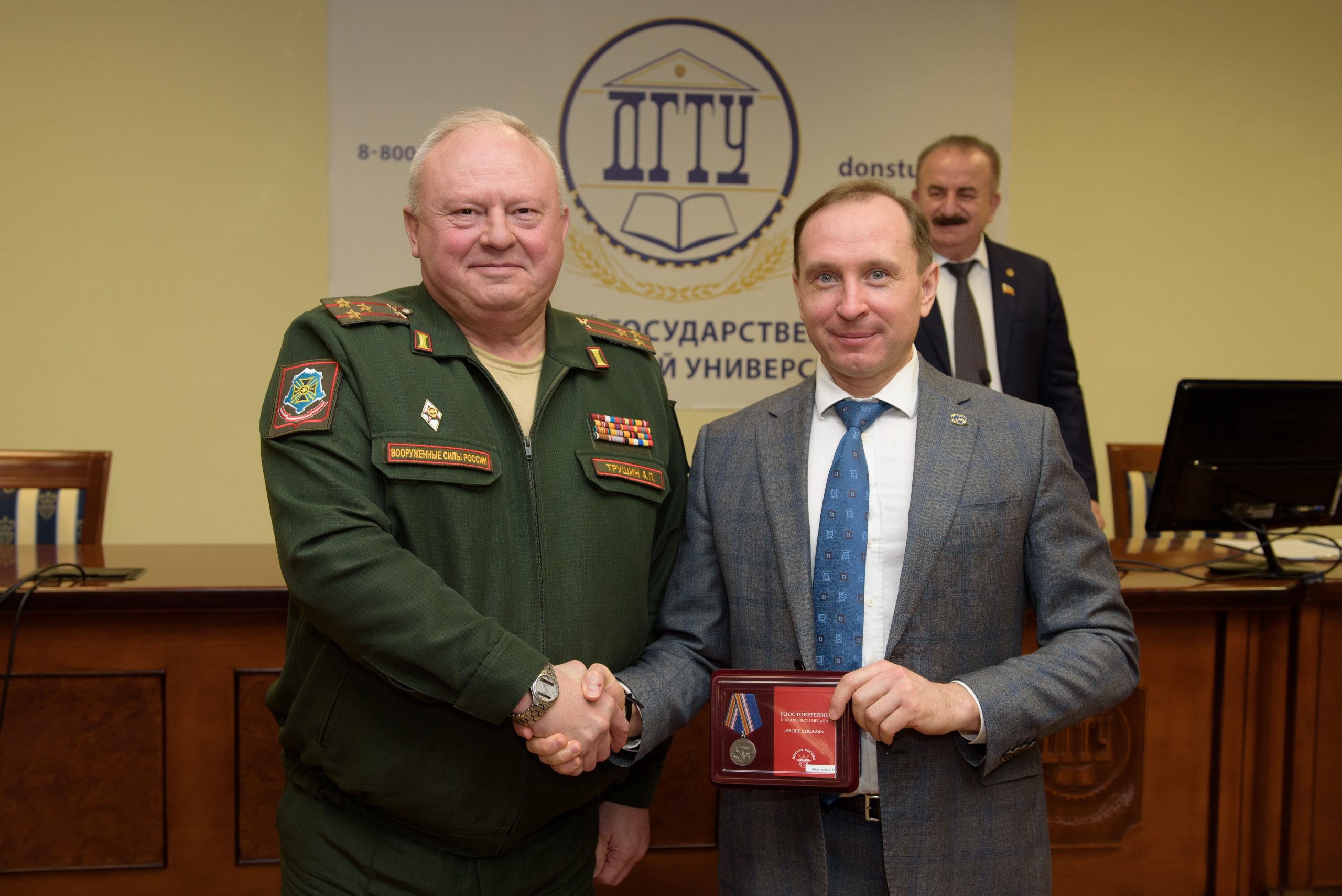 На проходившем 24 февраля 2022 года в ДГТУ Ученом Совете Председатель Регионального отделения ДОСААФ России Ростовской области вручил юбилейную медаль «95 лет ДОСААФ» ректору ДГТУ Бесариону Чохоевичу Месхи и наиболее активным членам ДОСААФ России за их весомый вклад в патриотическое воспитание молодых граждан России.
