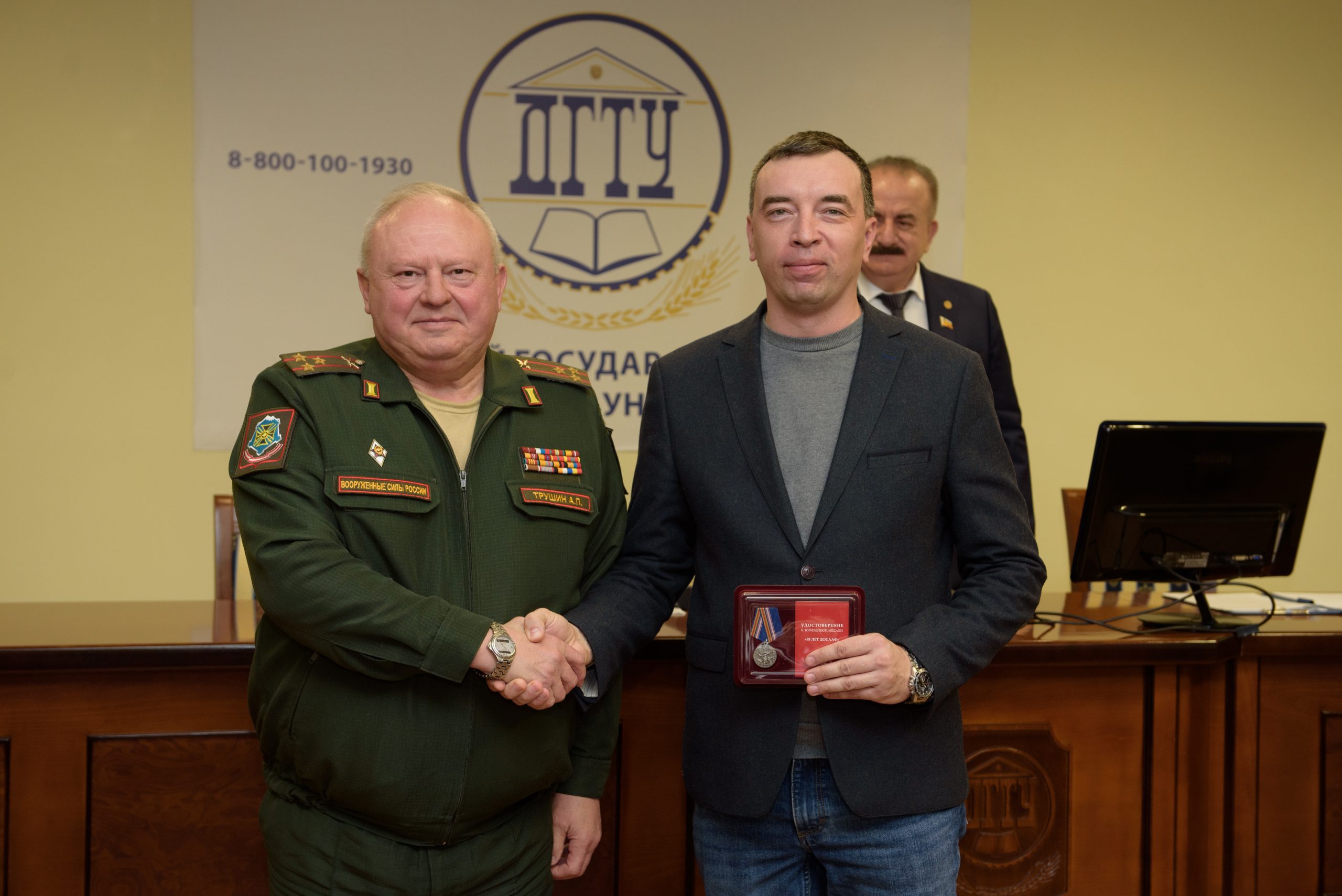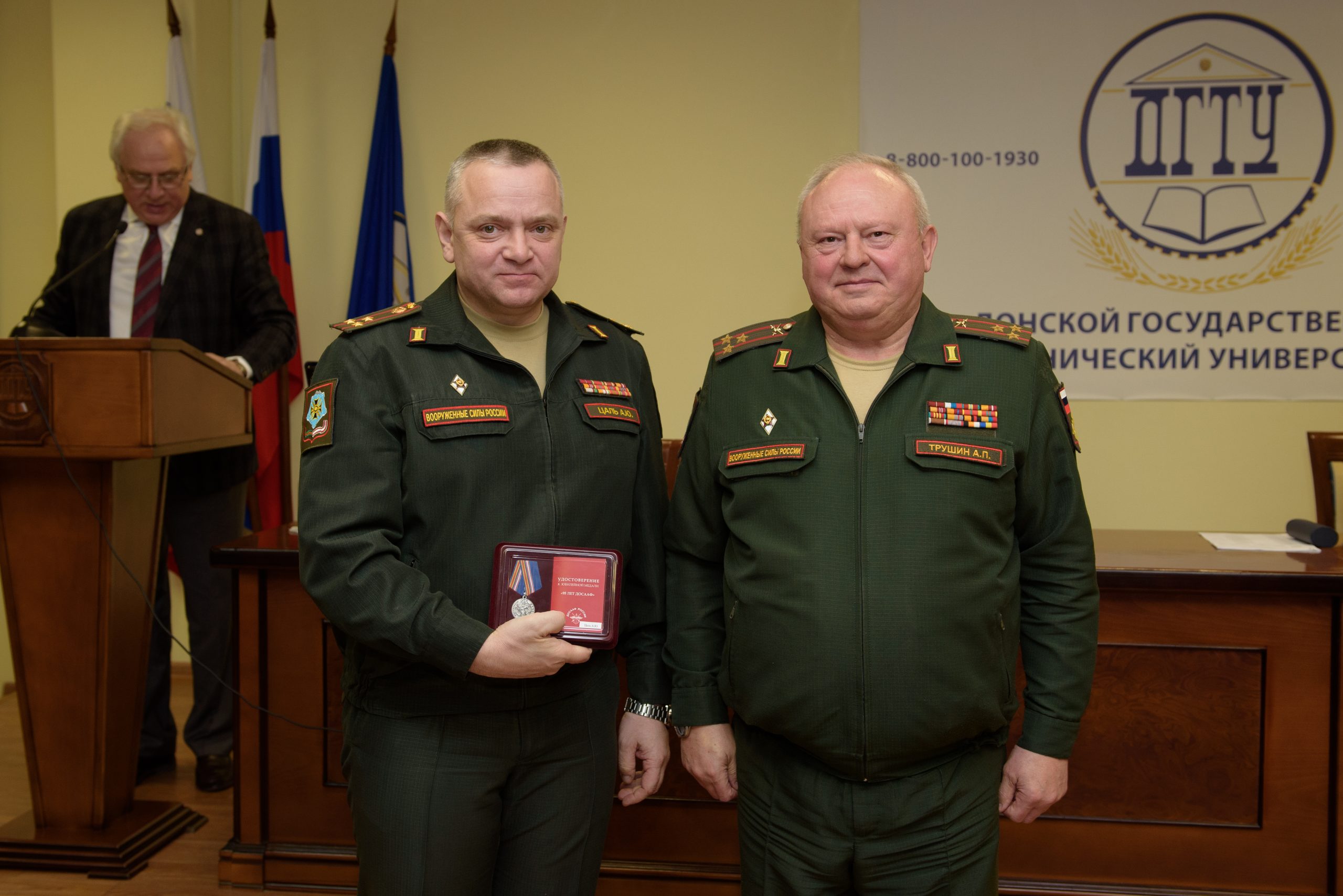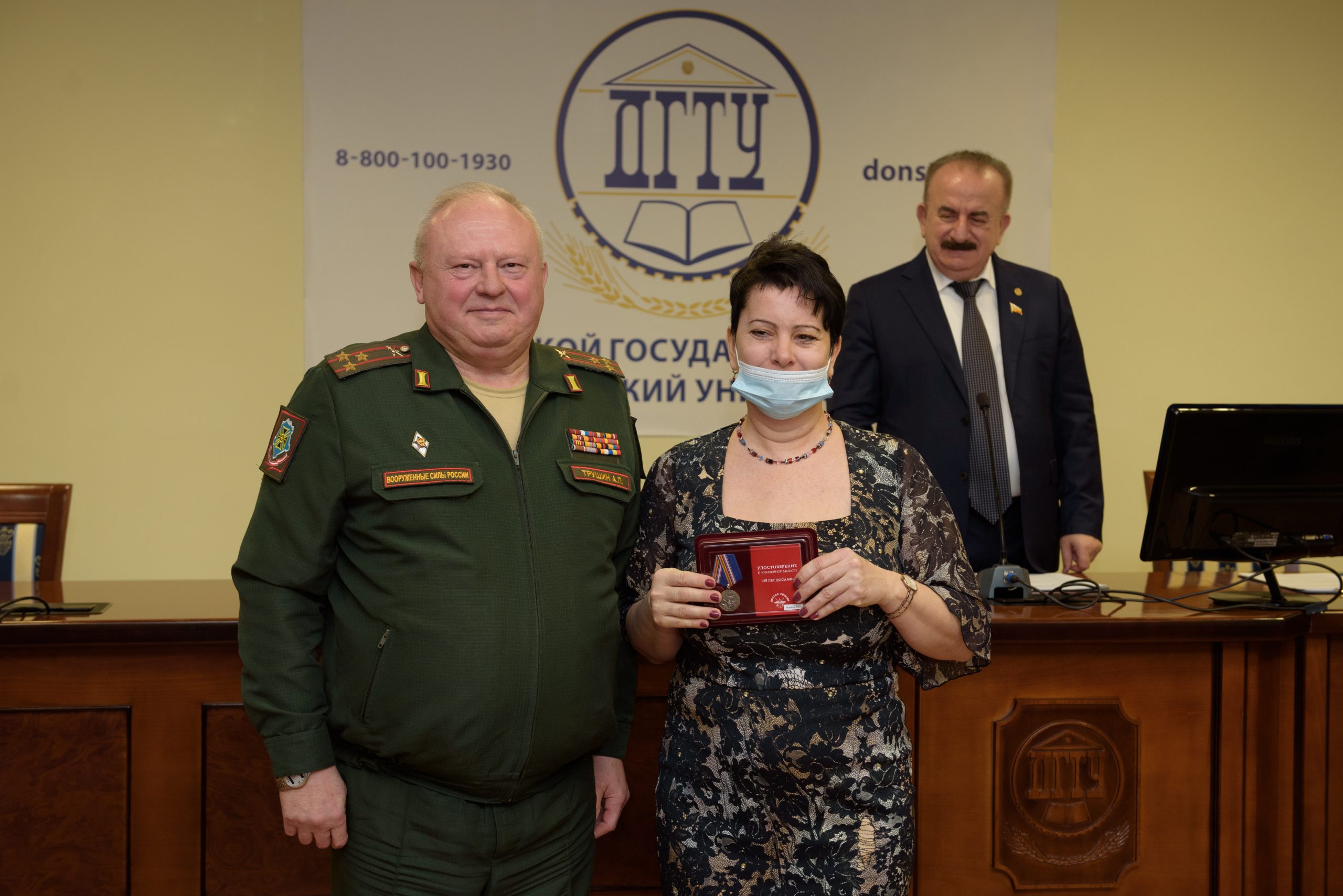 На проходившем 24 февраля 2022 года в ДГТУ Ученом Совете Председатель Регионального отделения ДОСААФ России Ростовской области вручил юбилейную медаль «95 лет ДОСААФ» ректору ДГТУ Бесариону Чохоевичу Месхи и наиболее активным членам ДОСААФ России за их весомый вклад в патриотическое воспитание молодых граждан России.