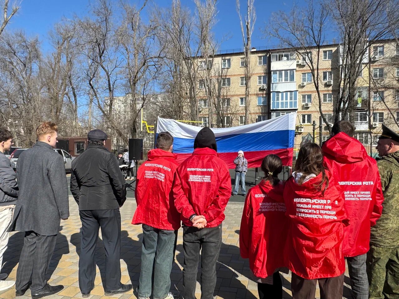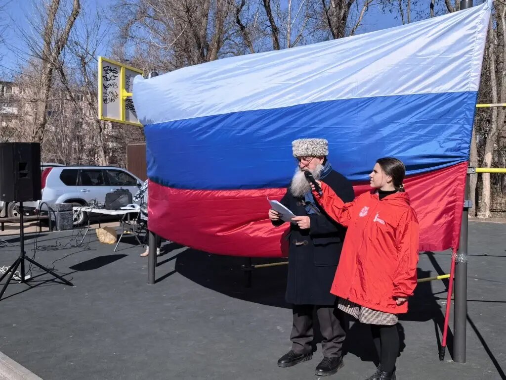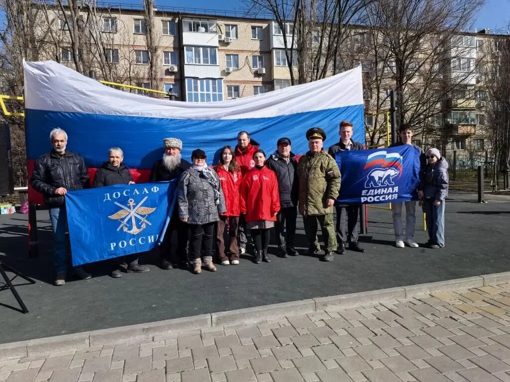 Ростов-на-Дону, 14 марта 2026 года. Накануне празднования дня воссоединения Крыма с Россией, Региональное отделение ДОСААФ России Ростовской области совместно с волонтёрами роты «Боевое братство» партии «Единая Россия», представителями общественных организаций ТОС-2 Советского района, творческой группой «Странное лето» (рук. Г.Е.Куприянов), поисковым объединением «Миус-фронт» (рук. А.Ю.Кудряков), Российским военно-историческим обществом и депутатом Заксобрания Ростовской области Сергеем Александровичем Ковалёвым организовали масштабную военно-патриотическую акцию в сквере «Семицветик».
